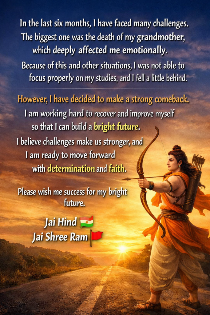 However, I have decided to make a strong comeback. I am working hard to recover and improve myself so that I can build a bright future. I believe challenges make us stronger, and I am ready to move forward with determination and faith.