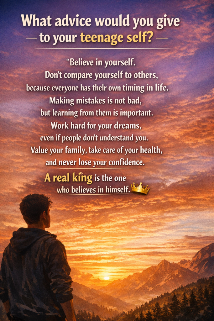 “Believe in yourself. Don’t compare yourself to others because everyone has their own timing in life. Making mistakes is not bad, but learning from them is important. Work hard for your dreams, even if people don’t understand you. Value your family, take care of your health, and never lose your confidence. A real king 👑 is the one who believes in himself.”